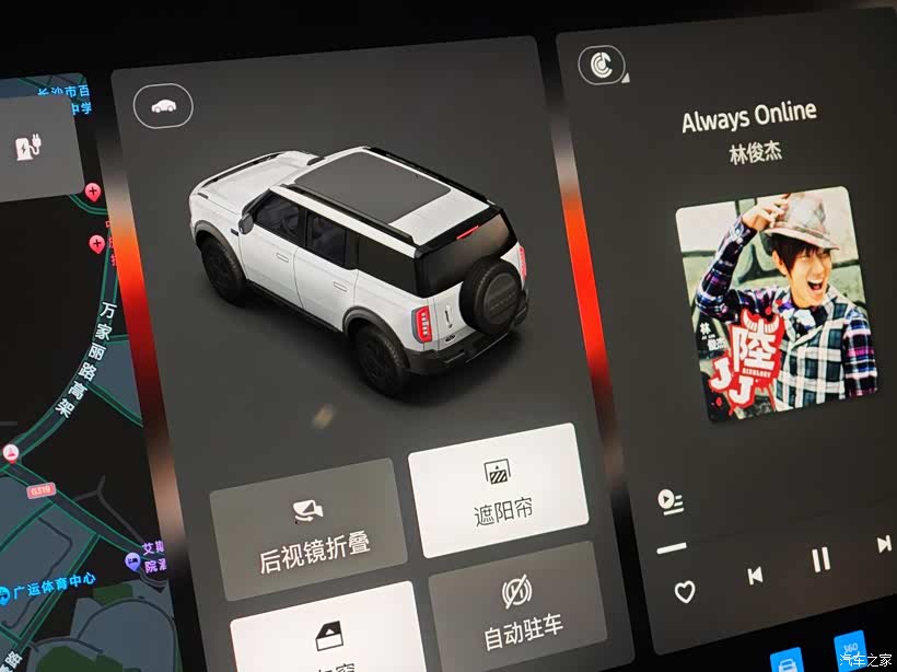 下了高速,去营地最后有一段几公里长的碎石土路,正好让我试试它的本事。我把驾驶模式转到了“自动越野”档位,系统自己就会去调节动力分配。开起来的感觉很稳当,虽然能感觉到路面的颠簸,但传递到车里是一种有韧性的“晃动”,而不是生硬的冲击,坐在车里不会左摇右晃,我爸妈坐在后排也说能接受,比想象中舒服。