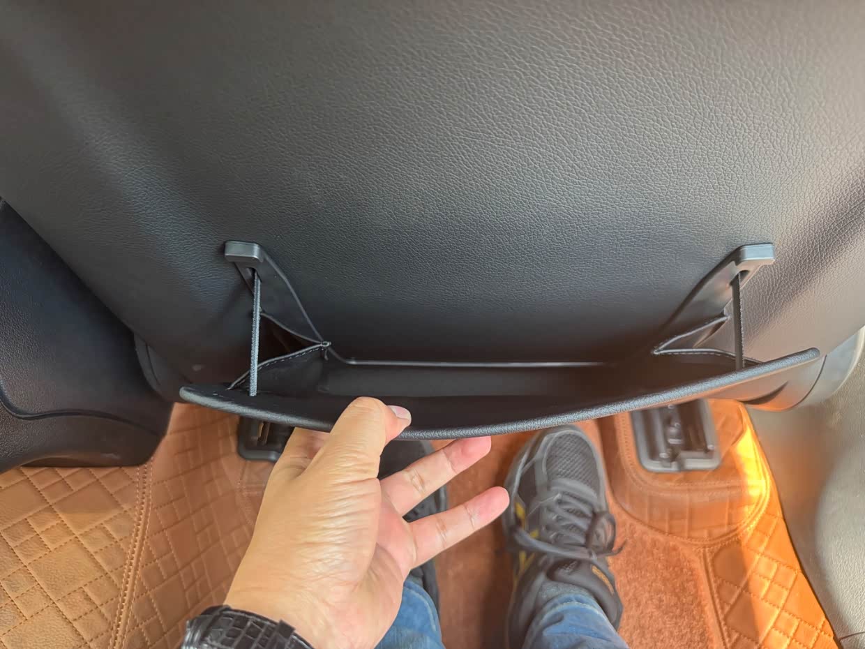 前排座椅后面还有一个很不时尚的储物格,可以放点日常小用品,像袋子呀,手套呀,薄的书本之类的。