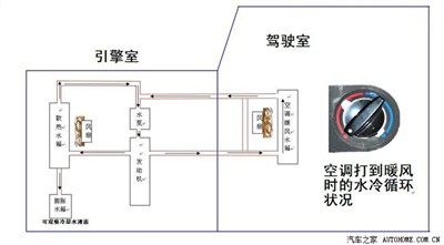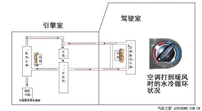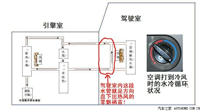 流到了空调暖风水箱里,小风扇一吹,啊!很温暖啊!一直循环就一直吹暖风了。