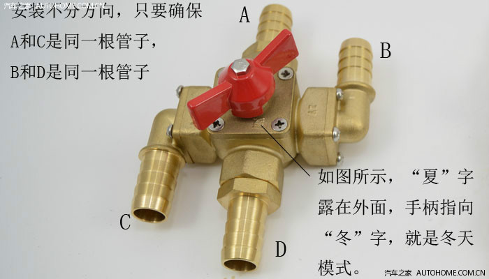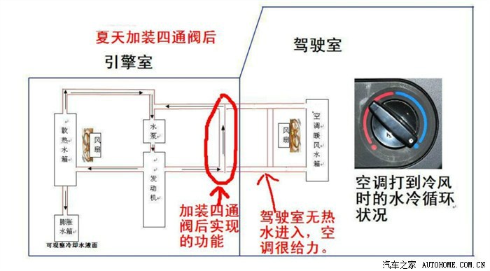 四通阀(不要觉得很复杂,那么多开关看得头大),其实就是给驾驶室外面的那两根水管短接了,这样热水就在