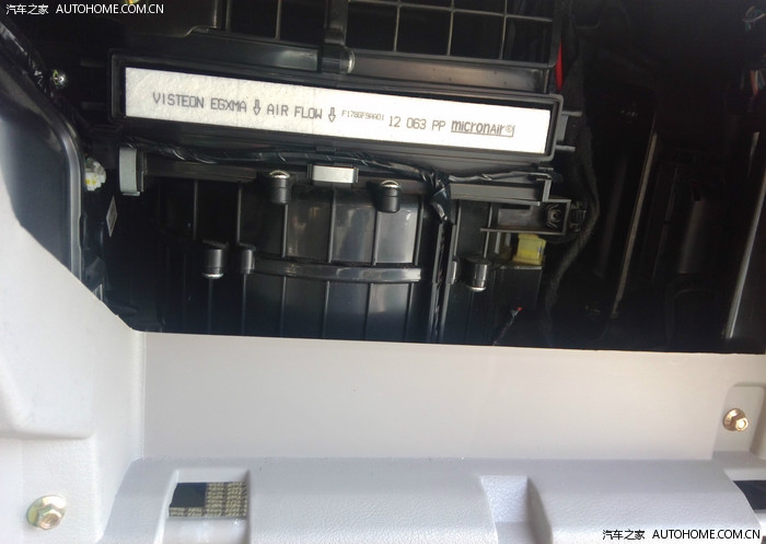 副驾驶的空滤图片,空滤下,应该就是空调放大器,有的车友反应开空调听到副驾驶的吱吱声音,就是这个放大器工作的声音,其实除非你不开收音机,不听音乐,要不很难听到的。另外问下五毒教众,这个空滤安装方向没错吧。