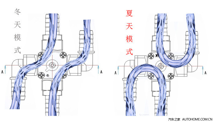 四通管的冬季模式。上面的两个阀门处于开位,中间的阀门处于关位,暖风水一进一出。