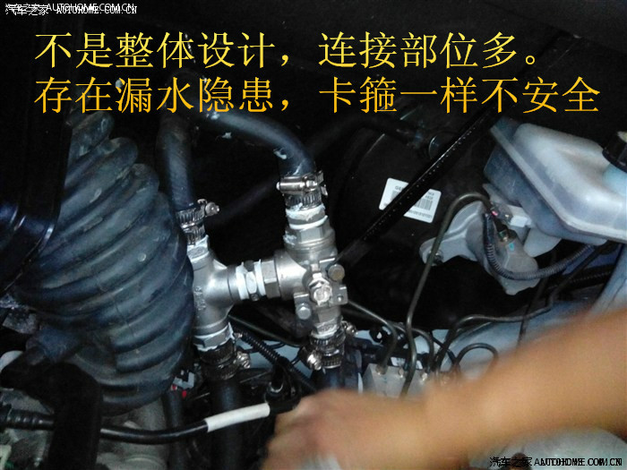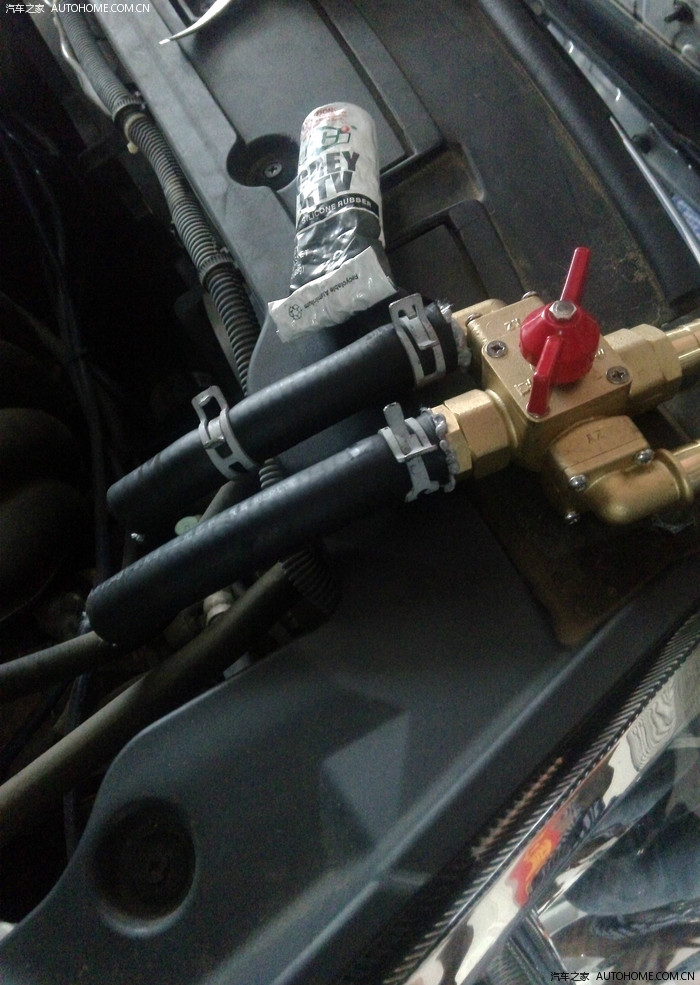 我的方案,水管比较接近发动机,而且阀门基本悬空,有车友说长期抖动,可能会松动,不过我自己看,又是卡箍,又是密封胶的,应该不会有问题。