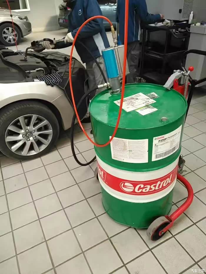 而且沃尔沃发动机要求5.7L的机油加注量往往小瓶要用6瓶会留出来小半瓶没法用,会造成严重浪费。大桶要用抽油机抽取,油枪可以精准控制油量喷出,从环保角度来讲更合理。