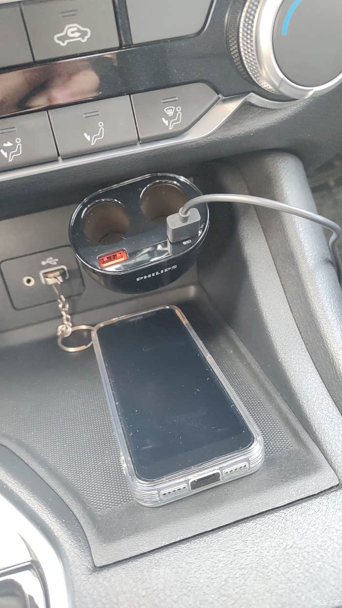 14代轩逸点烟器的位置是在中控空调出风口的下面,我觉得这个位置还好吧,加装上USB接口器也不会影响到挂挡和水杯放置等物品,我选择的点烟器接口器是一个1分4的设备,分为2个点烟器接口和2个USB快充接口,这样车里的行车记录仪,手机充电,按摩枕等都可同时供电,还可以上下自由调节位置,我觉得这个就真挺好的!