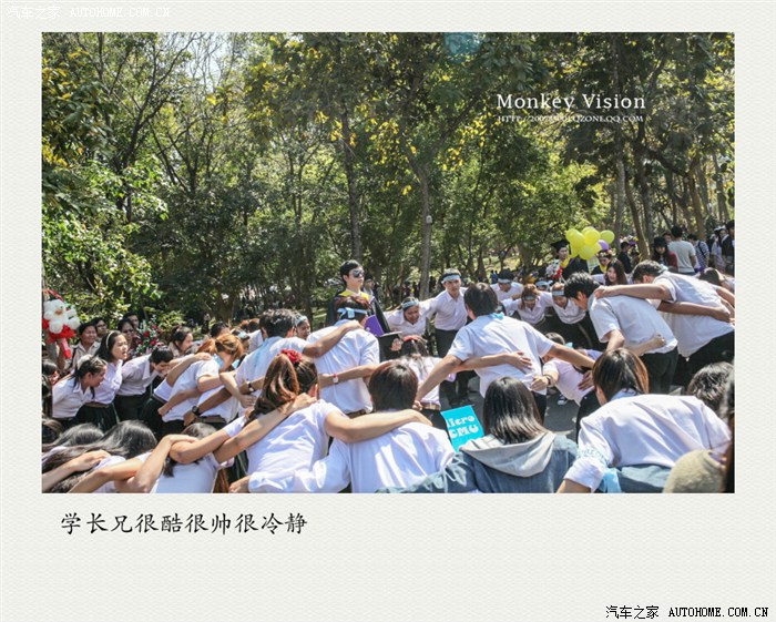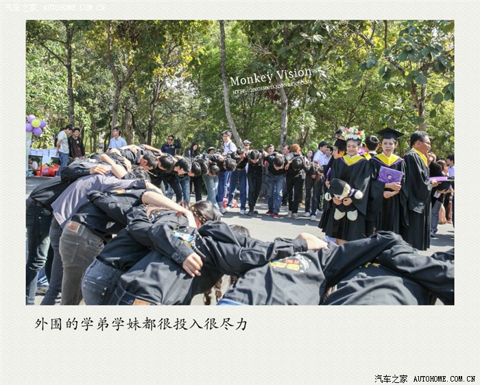 当天庆祝活动有个比较有意思的活动,就是低年级的学弟学妹会为学长学姐祝福(暂且这么说),学弟学妹二三十个人一组将学长学姐围在中心,然后围绕着他们踏歌或者有规则的致礼,整个过程全心身的投入,每一次呐喊都是铿锵有力,每一个动作都力量十足,相当卖力(按老婆的话说,要是换我们俩上去5分钟就倒下了,囧),炎热的天气下整个校园洋溢着浓浓的青春。