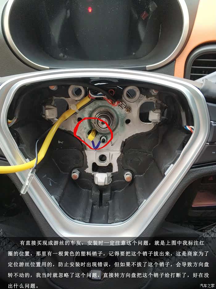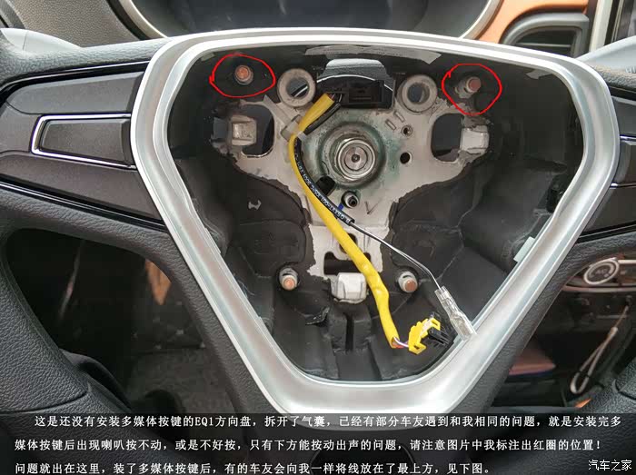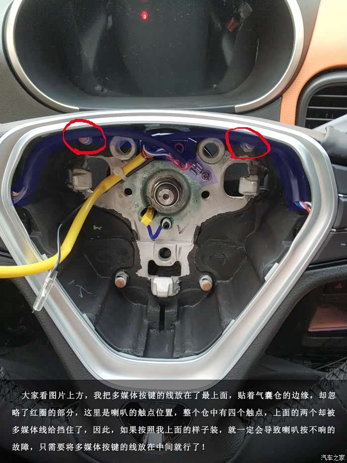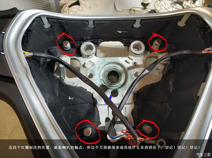 简述下问题,之前曾安装方向盘的多媒体按键,装好气囊后,发现喇叭上方根本按不动,也没有喇叭声音,一开始并未找到问题出在那里。 后来在论坛中问了下,有车友回答是线束导致的,正好之前缝制的方向盘套在安装时不小心划伤了,非常影响手感!于是昨晚准备重新缝制一下方向盘套,就把方向盘拆下来了,果真发现了喇叭不能按响的问题所在。 这里发下图片,分享给大家,避免再有自行安装多媒体按键的车友走弯路,顺便分享下手缝方向盘套的经验。重要的事情说三遍,上图四个红圈是喇叭触点,千万千...