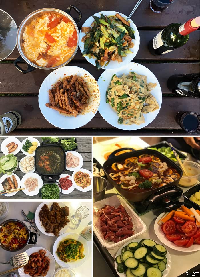 8.想知道我们到底吃什么、怎么吃吗?几次房车经历,早就总结出了经验:房车上的煤气灶并不给力,要想又快又省力地吃到热腾腾的饭菜,电饭煲和电火(炒)锅才是真正的神器,火锅底料、速食汤料、各种烧菜料、下饭酱菜、挂面......都可以从国内带去,越充分越好。看看我俩的行李,其中只有两个行李箱是私人物品,纸箱里是电饭煲和电火锅,圆的是帐篷,塑料包里是睡袋,还有一箱拖线板电吹风电水壶等杂物。旅行的时候,隔几天去大超市采购一些新鲜食材放进冰箱,到了营地,厨艺达人们就开始张罗晚餐喽,时常把旁边的老外馋得不要不要的。这也成为和当地人搭讪的好机会。