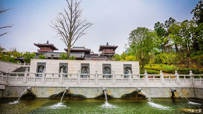 我们从东入口进入景区,首先看到的便是一处广场,一座大大的圆形景观池映入眼帘。池中有数朵精致的莲花,这是一处喷泉,会在合适的时间上演美丽的喷泉景观。从这里开始,我们就走进了佛顶前苑。