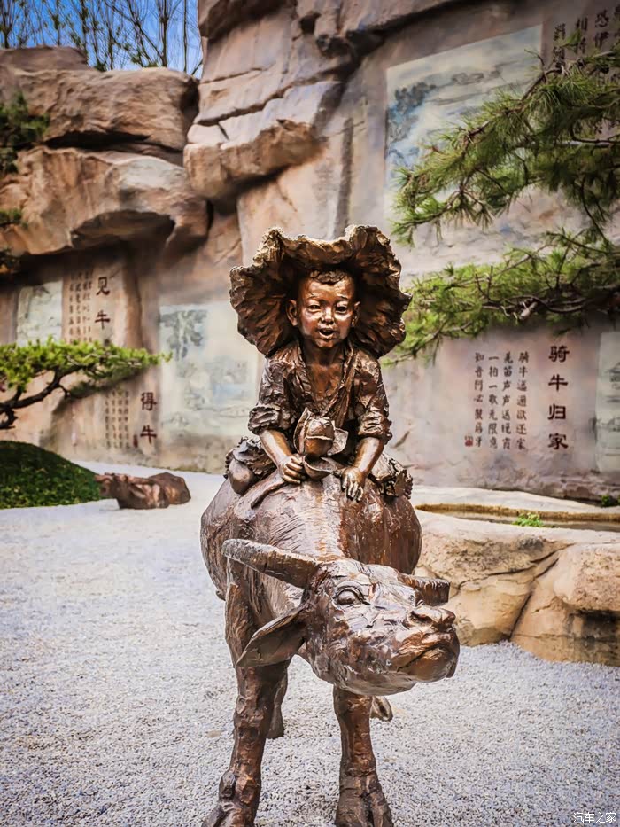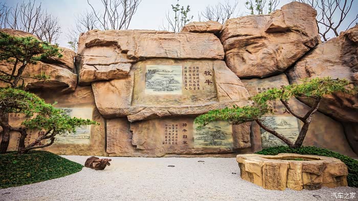 穿过集贤桥,便能看到十牛图塑石假山。十牛图塑石假山长度达六十五米,上面刻有“十牛图颂”。“十牛图颂”为宋代廓庵师远禅师所作,廓庵师远禅师为南宋初时临济宗的禅师。“十牛图颂”反映了禅宗修行的整个过程,“十牛”是比喻人的佛性显现,十种不同的状态。“图”即以图显示,“颂”就是用偈颂的方式,说明十牛图的含义及其中的道理。“十牛图颂”用十幅图画描绘牧牛的过程,以牧童比喻修行者,以牛比喻妄心,依次指出禅者由修行、开悟、调伏业识,终至见性,进而入世化众之心路历程。