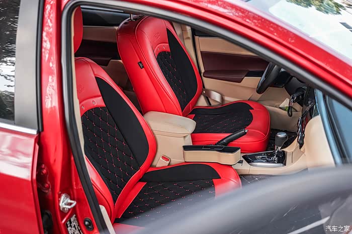 还有就是座椅,原来是米色的风格,我全部包了红黑色搭配的座套,