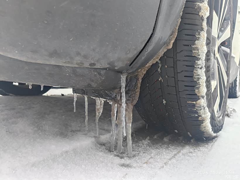 到达目的地,我发现车轮的后面,特别是前车轮后方塞满了积雪,这还不是松软的,而是有些冻住的感觉。