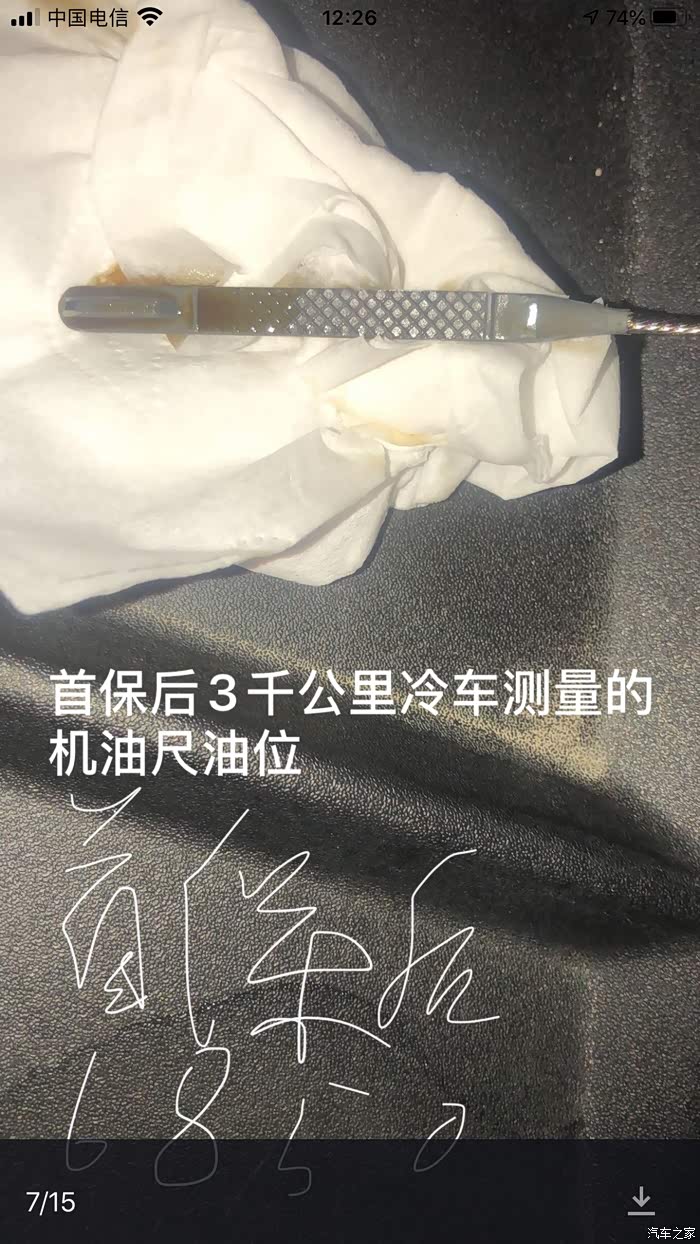 本人君威GS尊贵,今年2月3号在合肥惠康4S店买的,新车提车时冷车看了机油尺油位是在上限位置,提车开了一段时间后看了机油尺油位有点下降,后来我就开始注意??了,在3800左右的时候机油尺油位快接近下限了,吓得我不敢跑了,当时拍了相片,我的是冷车测的机油尺油位,我觉得这样测量是最准的油位,在3902公里就赶紧做首保,做首保加的是0w-20的机油5升机油,机油品牌是道达尔的,做完保养后启动发动机检查有无漏油等,检查完熄火后等了20分钟后抽出机油尺擦干净,在插进去拔出来看了机油尺油位是在上限位置,现在跑了7202公里机油尺油位马上又快到下限了,这损耗也太大了吧!保养完才跑了3千公里左右呢!车友们你们觉得这是正常损耗吗?下面我上图,大家看看吧!