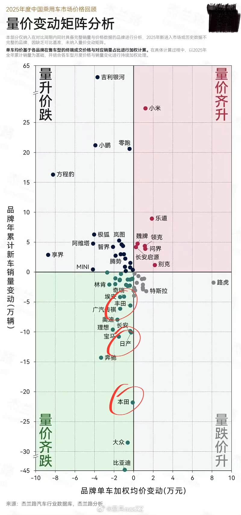这说明日系靠降价也没办法挽回销量,根据量价矩阵表可以看到,日系三兄弟丰田、日产和本田都已经进入下降区间,后面难救了!