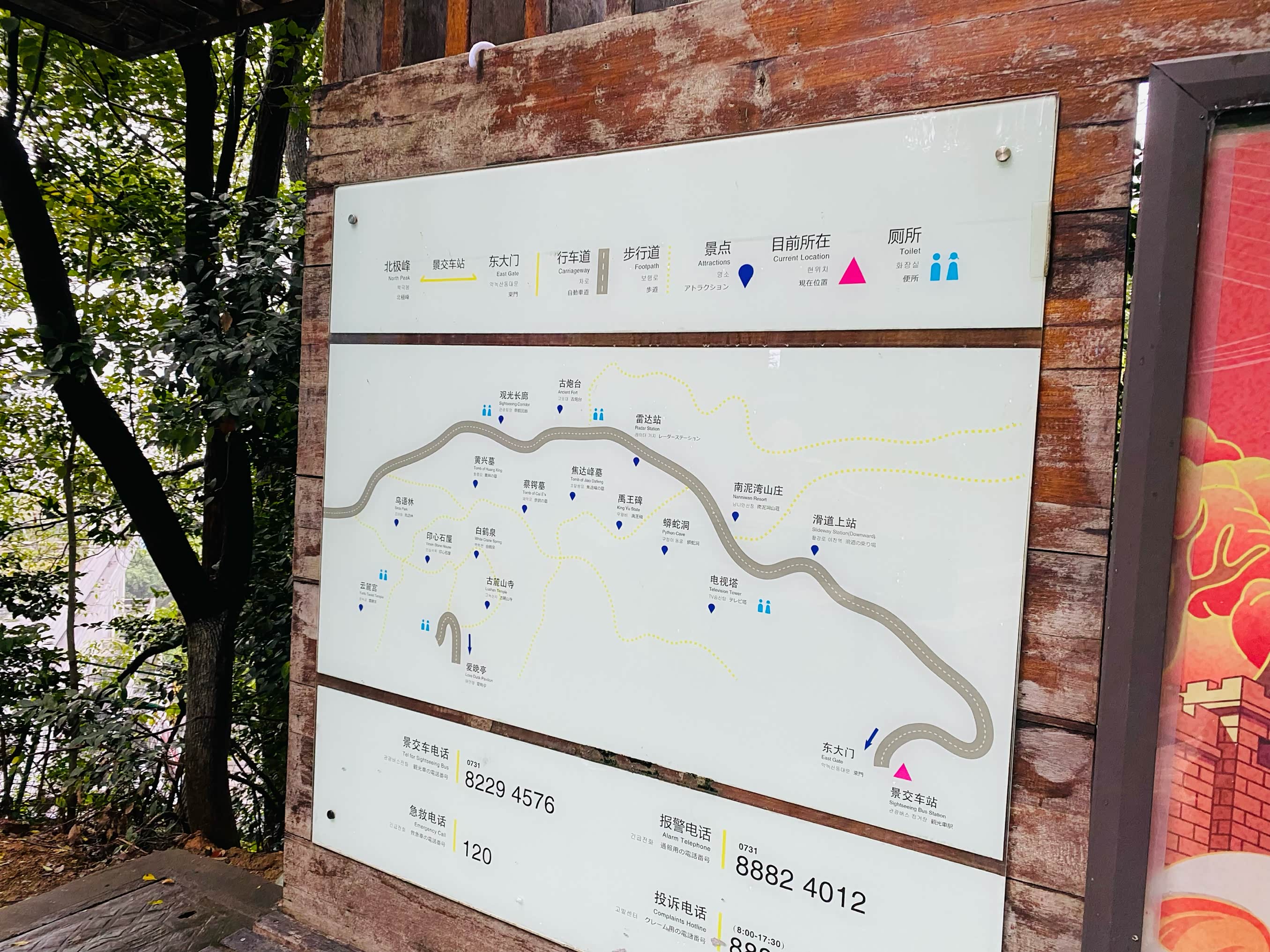 登山的路线图,我先把它拍下来了,一会儿爬山的时候可以查看一下,这边也要建议大家走东门爬确实风景景点是非常多的。如果你只想看一些文化景点,你可以选择在湖南大学东方红广场那边开始登山。
