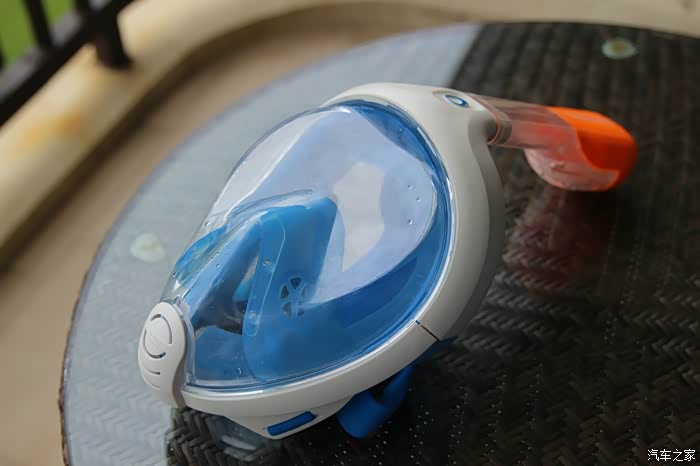 一体式浮潜脸罩,初学者的福音,可以用鼻子呼吸,压根不用学就可以随意浮潜了,缺点就是带在脸上有点吓人。