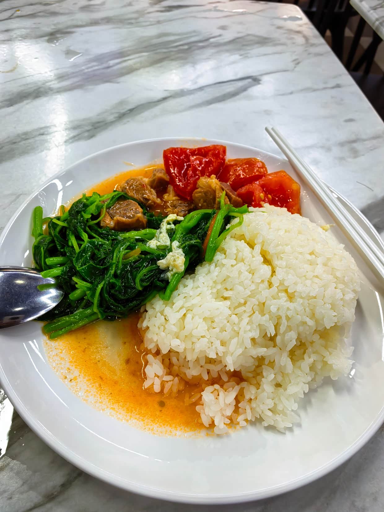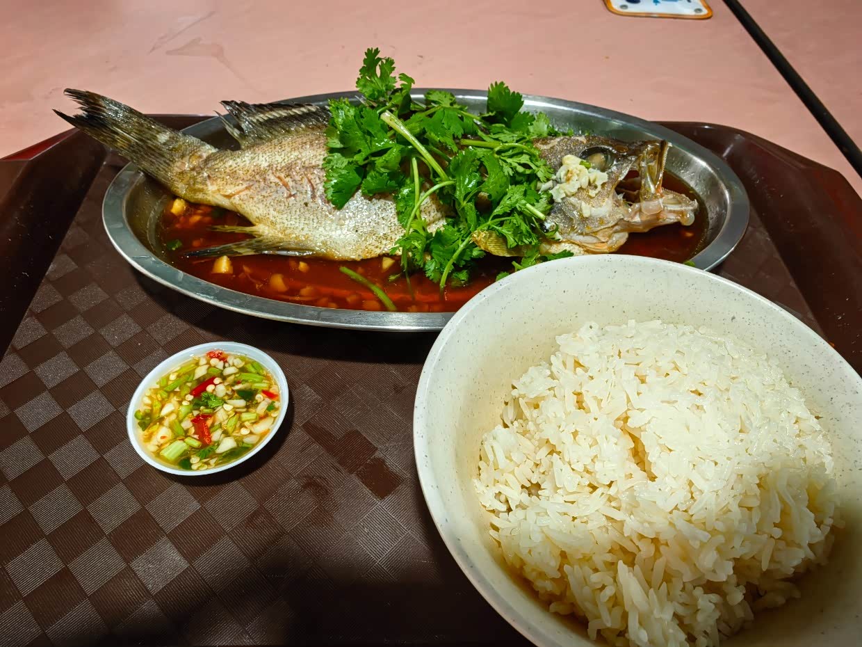 点了两个菜一碗米饭,大概二十多不到三十新币,也就是一百五人民币不到