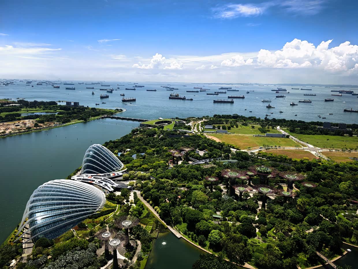 楼下两椭圆的是花琼和云雾林,右手是擎天树,远处就是马六甲海峡了,繁忙的航运