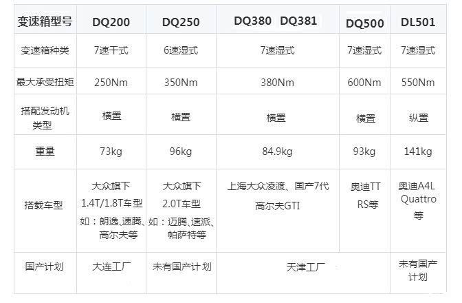 1、DQ200,干式7速双离合变速器,能承受的最大扭矩为250N*M,主要搭载于中低排量的车型,如速腾、高尔夫等。DQ200具有更好的燃油经济性、更便利的动力总成摆布性等特点,但是只能适用于最大扭矩小于250Nm的中小型发动机。DQ200也是问题最多的一款,大量用户反映汽车怠速抖动、换挡不平顺等问题,甚至出现使用几万公里就坏了更换双离合的,所以这款变速箱是不推荐的。