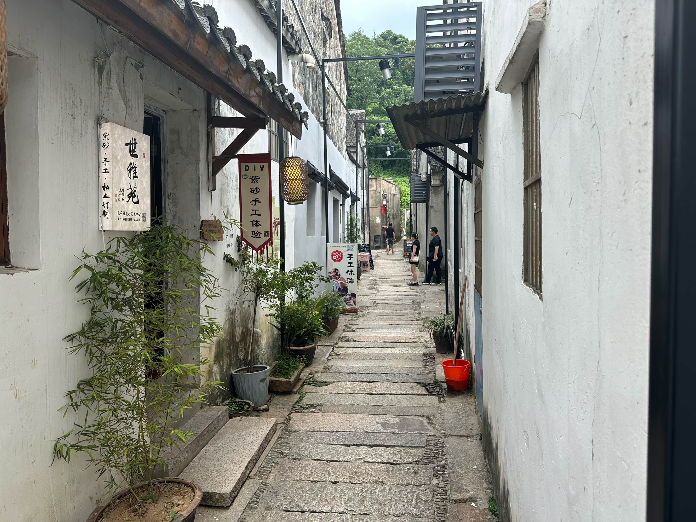 来到紫砂壶的故乡陶都宜兴,自然不能少了逛一逛陶器历史文化街区。第二天睡了个懒觉,在民宿吃完早饭后就来到第三站:古南街。这是宜兴紫砂的发源地,也是明清以来宜兴紫砂制造、生产、贸易的集散地。