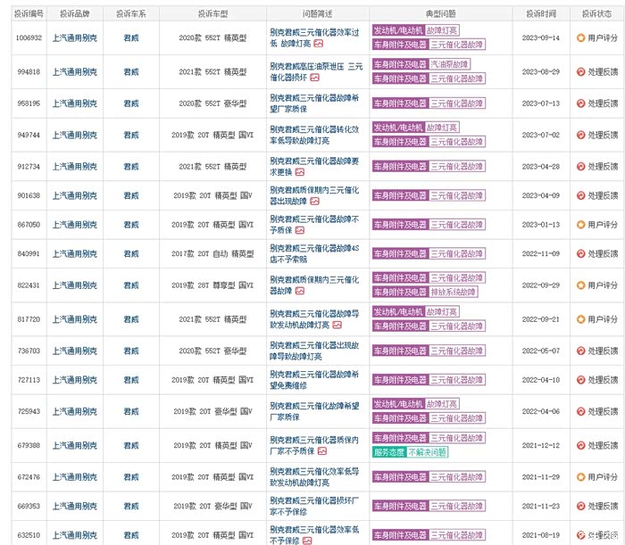 车辆故障灯亮,安吉星短信提示排气系统故障,去4S店检测,告知三元催化器故障,因过保需要自费更换三元催化。车辆从购置以后一直加的是中石化的油,从来没有加过小油站的油,才8万公里就出现三元催化故障。别克的品质太差劲,从车辆购置以来在第一年就出来两次故障灯全亮车辆抖动无法行驶的情况,检测后通信模块故障,打了导电胶处理,后面遇到后刹车尾灯漏水(刹车灯漏水只做了打胶处理),后羊角胶套损坏(羊角这个索赔成功),车内副驾驶门板异响。现在这个三元催化损坏如果自费的话起码要几千块钱去更换,同样的问题光车质网投诉的有几十例,作为有质量缺陷的产品,这个为什么要用户来买单?投诉以后回复就是让去4S店检查,检查也只是消故障码,跑了两天又亮故障灯,买君威的慎重考虑