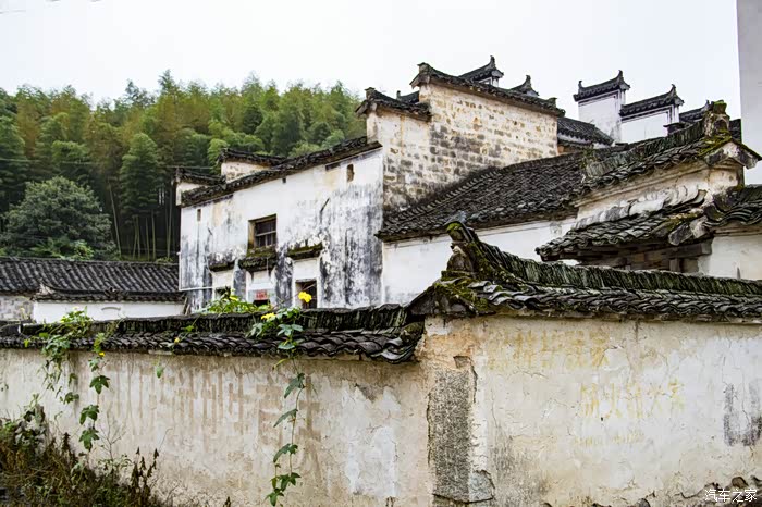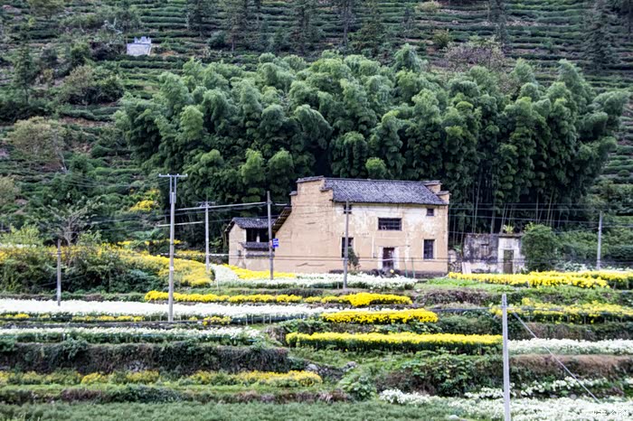 黄、白相间的秋菊,孤独的旧式徽居,在成片竹林的映衬下,彰显秋天的童话。