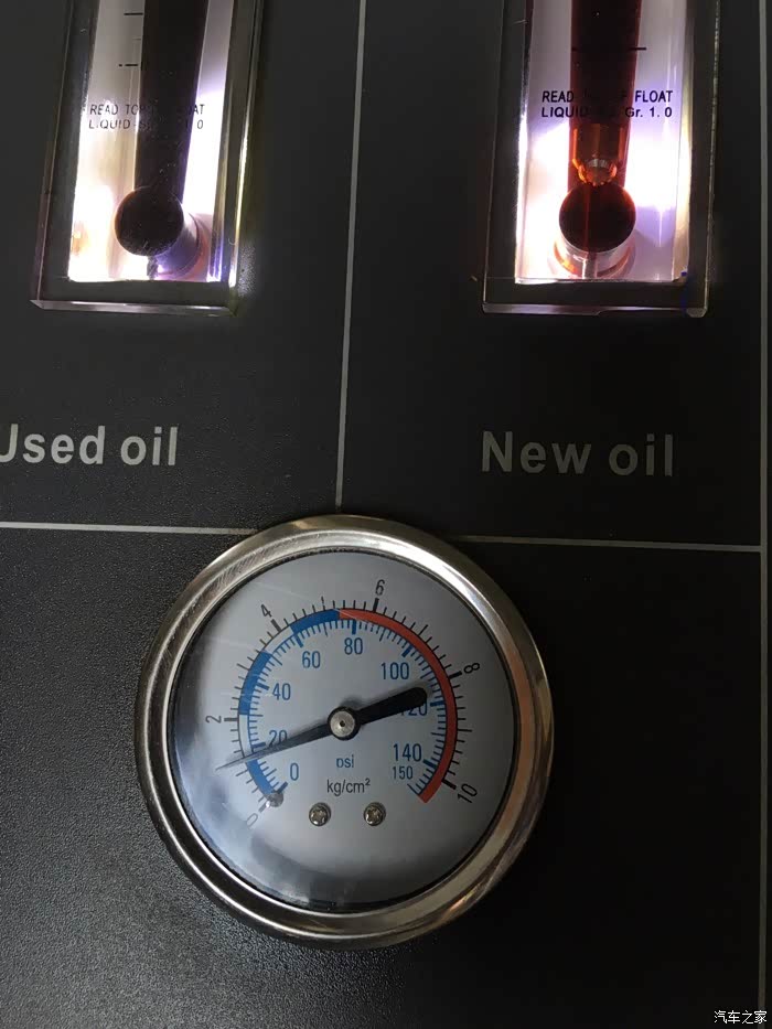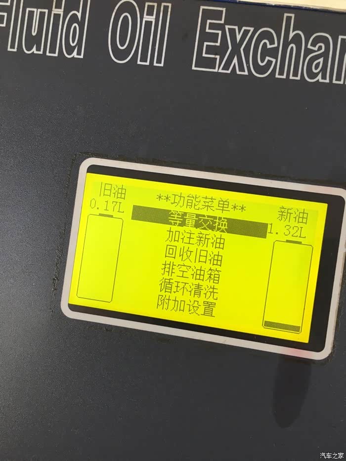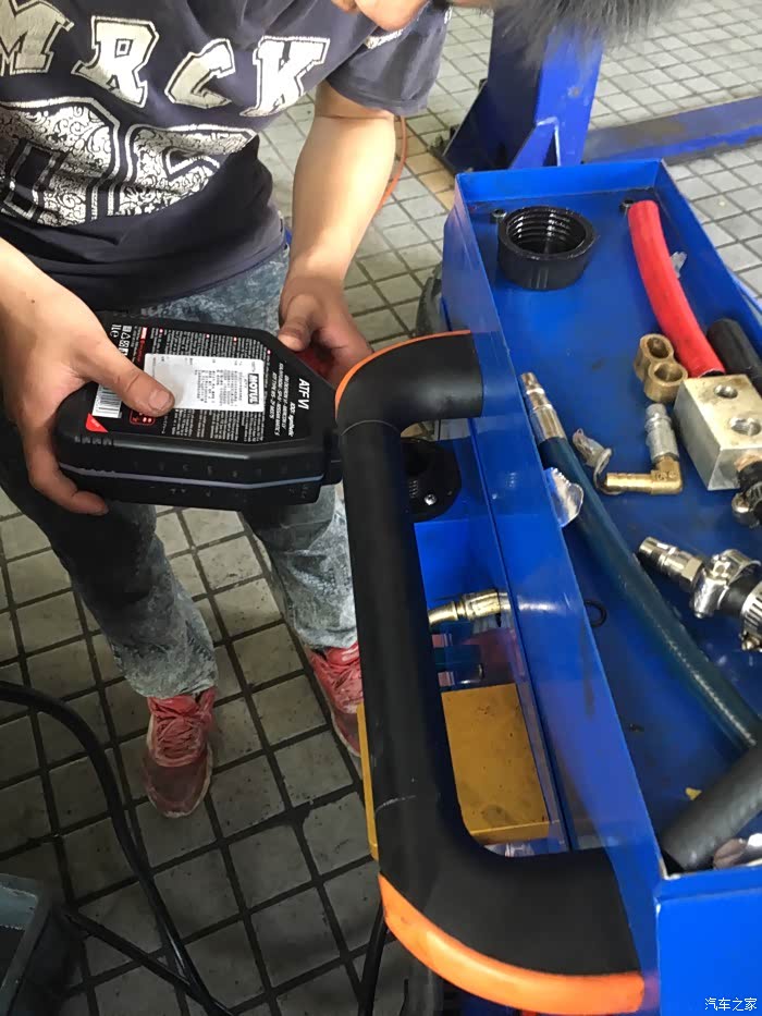 循环机正在清洗变速箱,左边是车上的旧油,黑乎乎的。