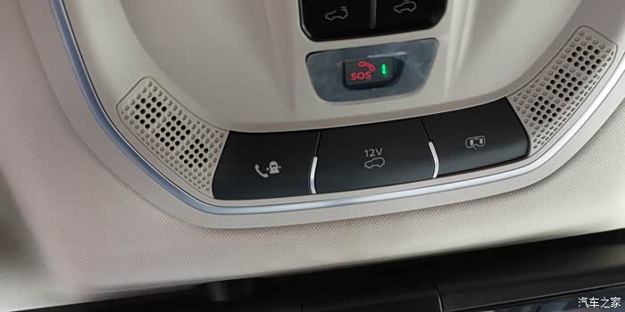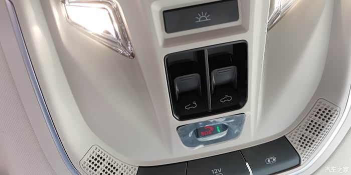 天窗按键分别是车内灯总开关、门控开关,人工服务按键,和紧急救援键,注意这个歪外接电源开关(外接电源插件位于空气滤芯左侧,支持额定功率小于等于300瓦的12伏直流电源,连接好用电设备后,启动发动机,按下车内开关即可,在这些按钮下面还配备了一个眼镜盒,方便车主放墨镜,近视眼镜 ,这个小盒子很贴心。