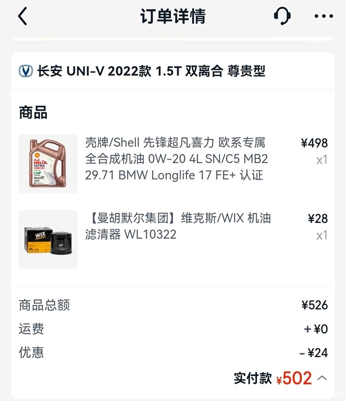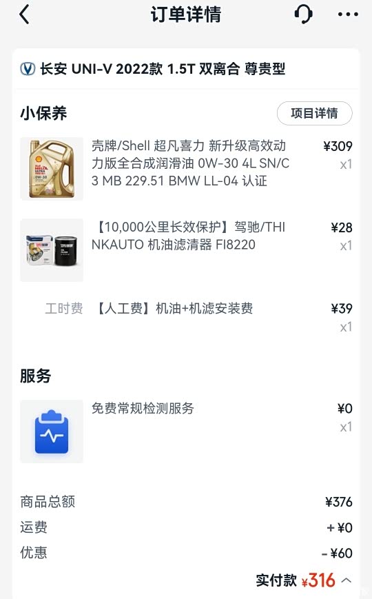 再看看我的保养成本。至今已经做了三次保养。首保上面已经说了,送的一次所以是免费。二保在途虎做的,在途虎app下的订单。用的壳牌先锋超凡喜力机油,包括机滤人工等,总费用502元。三保一样选择的途虎,因为囊中羞涩,所以选择了便宜一点壳牌超凡喜力,这次不带先锋,所以总共下来只要316元。在网上买了空调滤芯和空气滤芯自行更换,购买成本122元一套。由于雨刮器老化,也更换了一个新的雨刮器,成本69元。