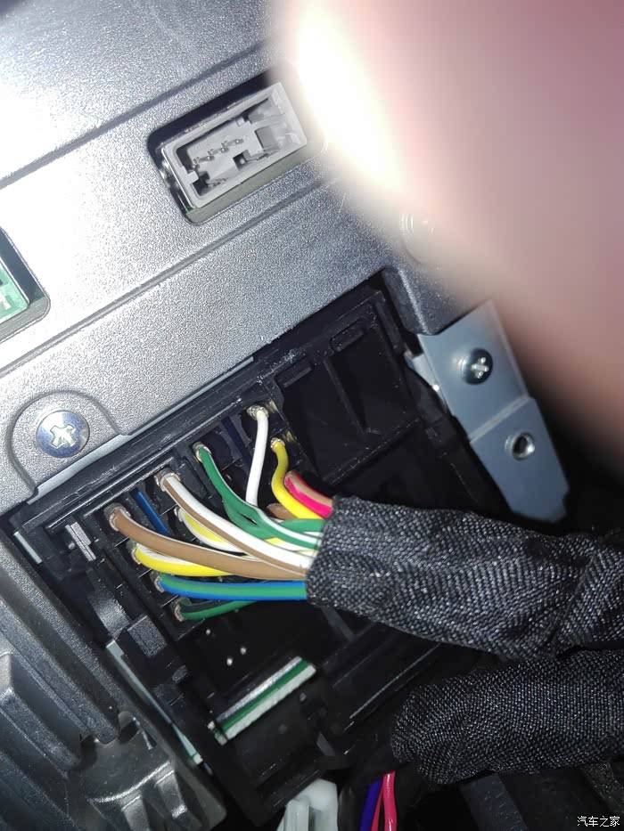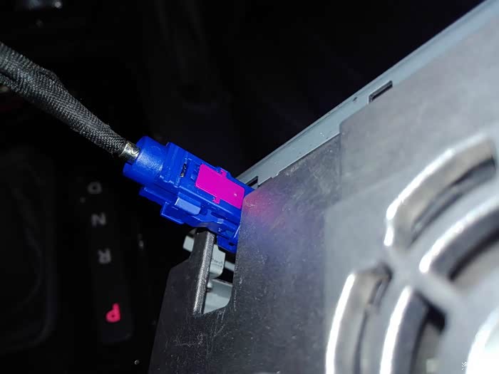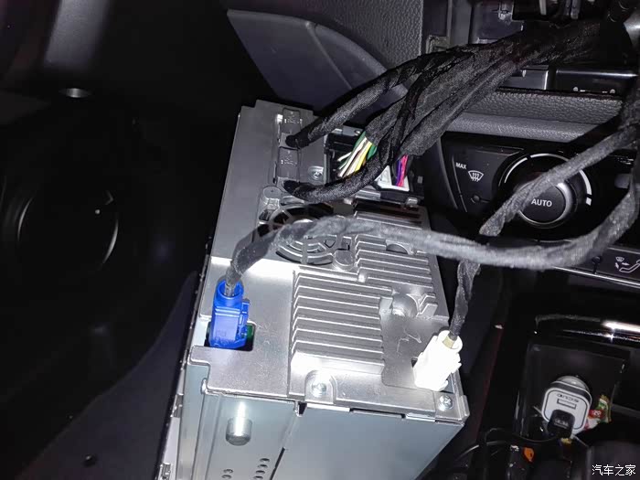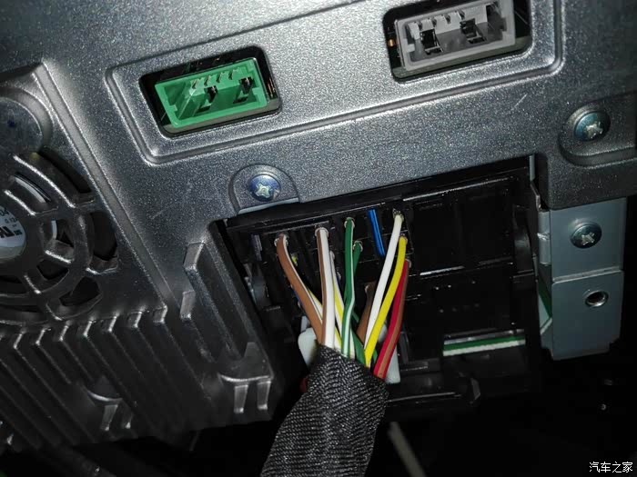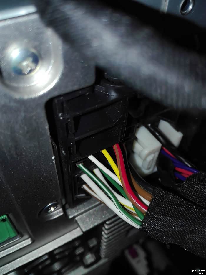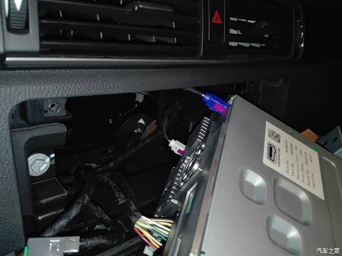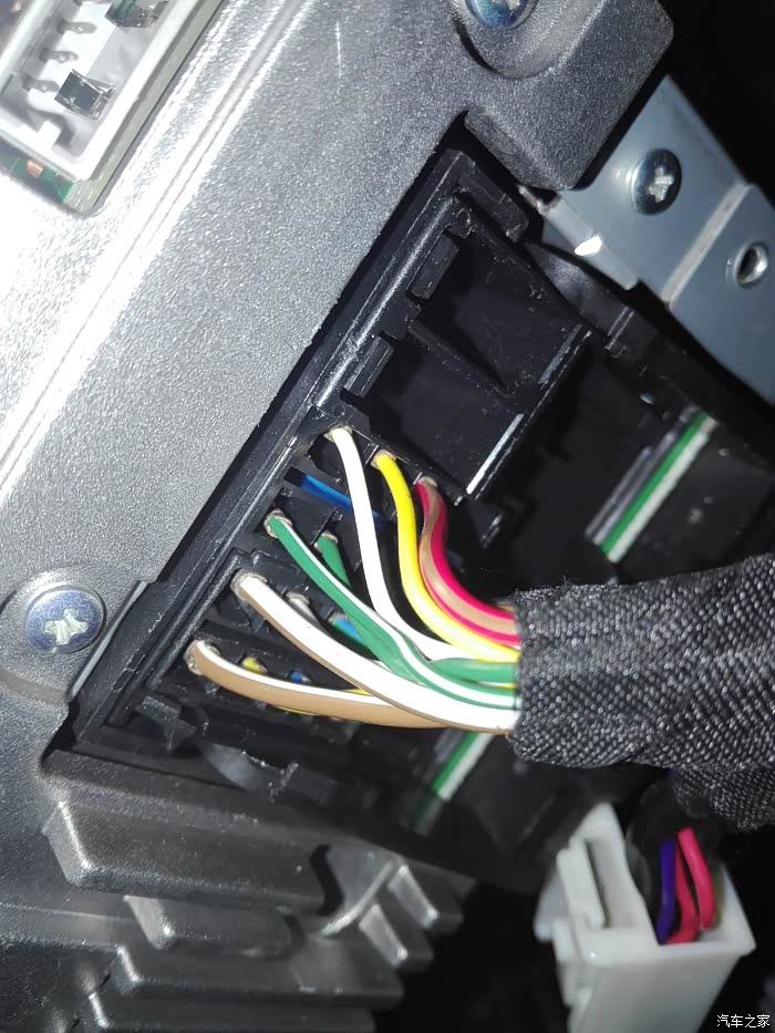 4、整体拉出导航,背面有五个插头,都有插头锁止结构,不能硬拽,插头和插座都有不同的颜色对应,不容易搞混。除了最大的那个黑色插头,其余四个插头捏一下就能解锁。线束最多的那个大插头锁止结构比较特别,有一个大拉手,拉起45度插头就整体松脱了。