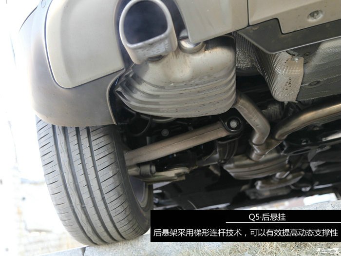 ▼从保险杠到发动机护板看,整个Q5的底部非常平整,一方面是美观,可能比美观更大的作用应该是可以在行驶中大大降低风燥,同时不必担心路面矮物剐蹭底盘,这样的底部看上去还是挺舒服的。