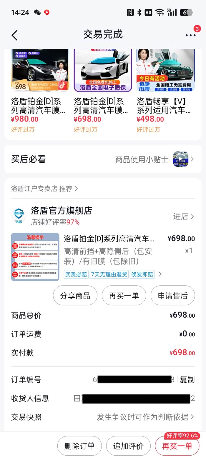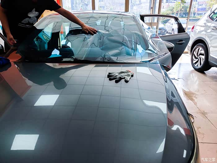 价格也不算贵,698块在网上订购包含四个车窗 前后挡 与天窗膜(包含免费施工与去除旧膜),车膜是先邮寄到我当地,然后短信告知施工地点,到膜当天我就预约贴膜。