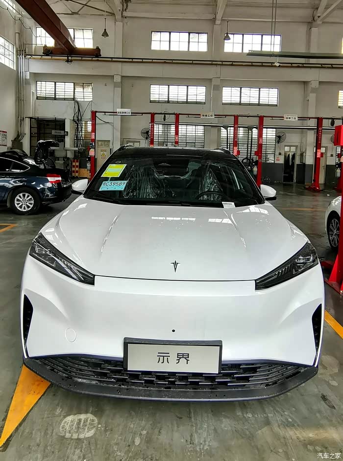 由于试驾车正在后台车间升级,我们稍等一些时刻。来到维护车间,一辆车身涂有“中国电动 法式驾控”“智驾全场 大有可能”字样的示界06静静地停在一侧,这款塞尚白内饰为暗夜星辰(暗色涂装风格)的车给我又一个异样的感受,白色外观更多了质感和时尚潮流。