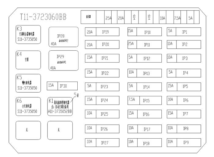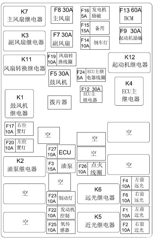 以前网上的是错的,这才是对的!群里来的图,我拿出来分享下,大家收藏备用吧!上图是前机舱内的,当然前机舱内的可以看盖板反面的说明,下图是驾驶舱内的保险丝图!1、前机舱内的 2、驾驶舱内的保险丝