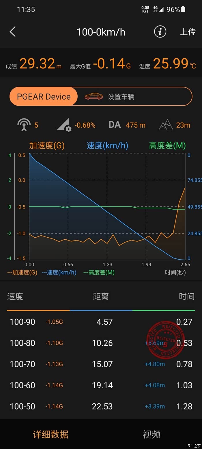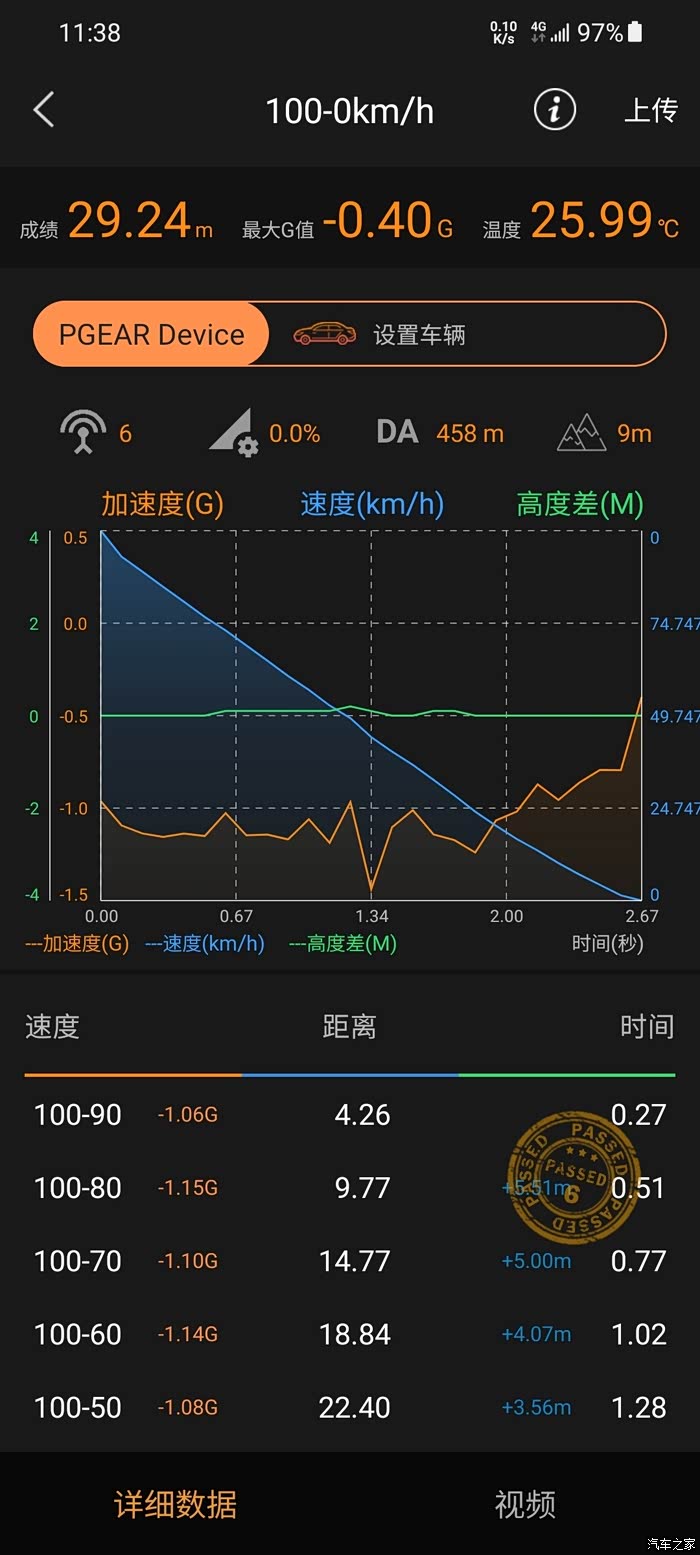前些日子换了ps4s的245 40r19的4个轮胎,现在这轮胎跑了2500公里,刚才用车涯测了一下(成绩只能用于车涯之间的刹车距离对比,不要和pbox对比)。冷胎,园区普通沥青路。气温26度。从单位开出去,3、4百米后测的。