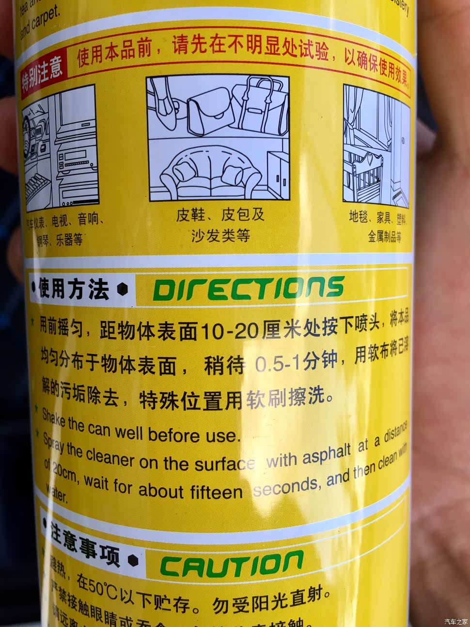 用于纤维和皮革时,先在隐藏部位喷上清洁剂使用查看是否会引起褪色或者起斑点,如过有的话建议慎重使用;