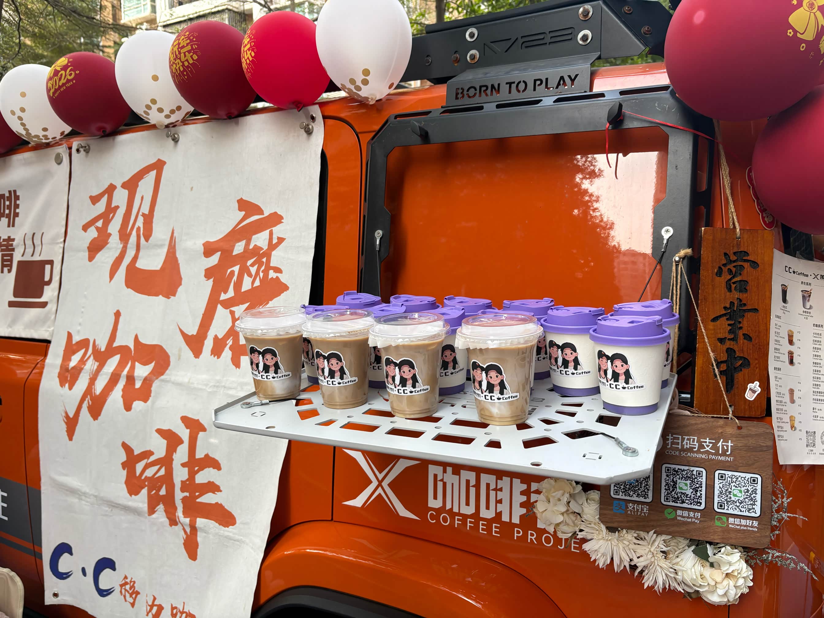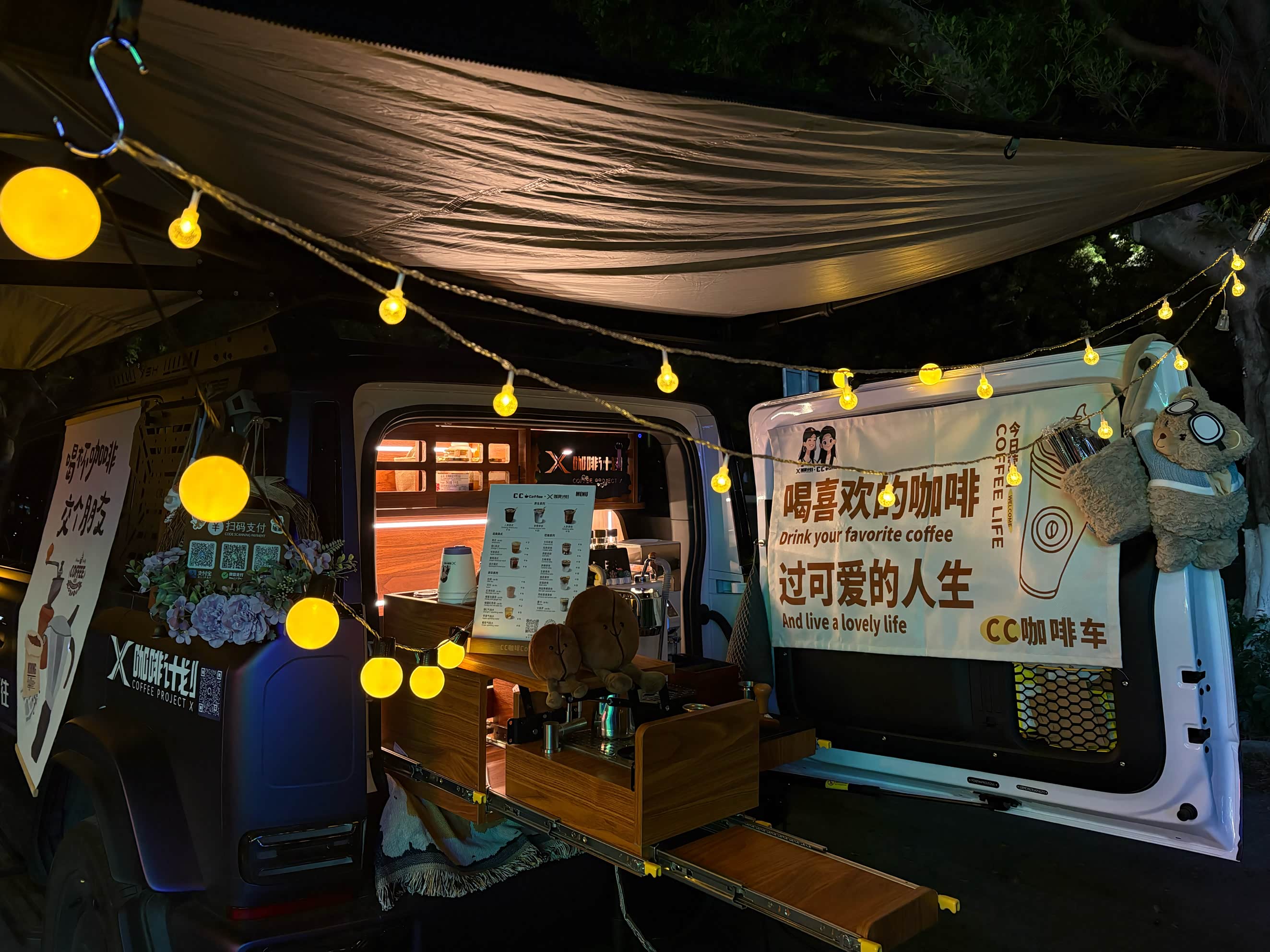 第一次出摊选在小区楼下。早上七点,打开尾门,展开折叠桌板,亮起暖黄串灯,“CC Coffee”的招牌在晨光中亮起——咖啡香漫开的刹那,小区上班的邻居全围了过来。那天我们卖了47杯,手忙脚乱却兴奋异常。