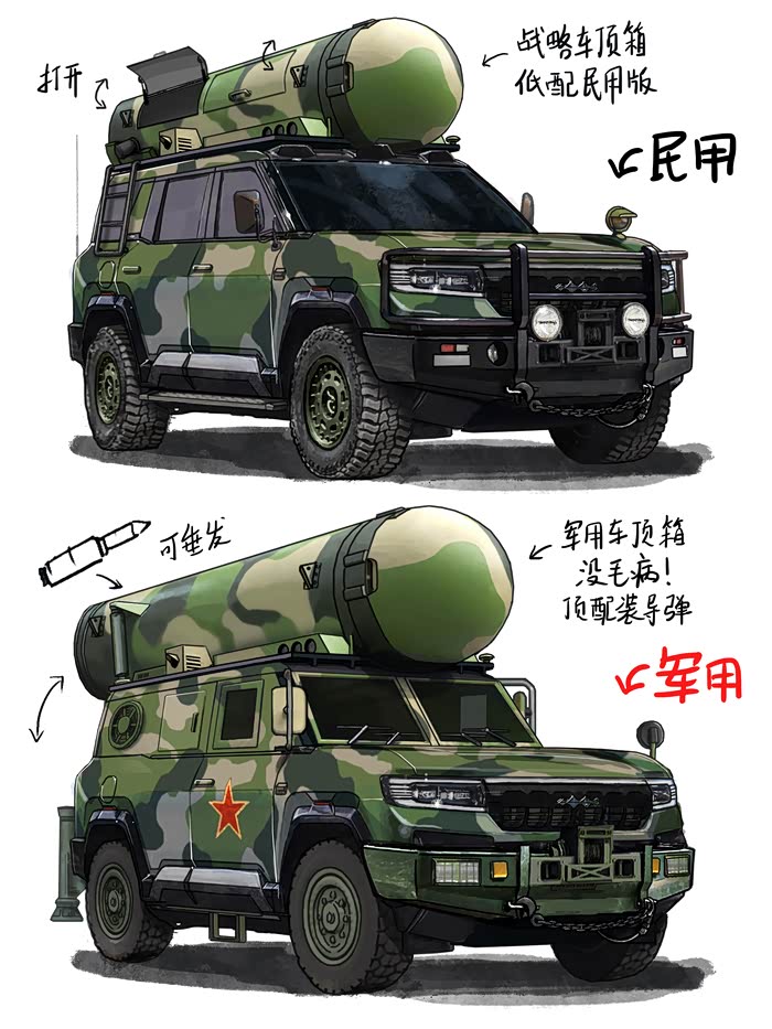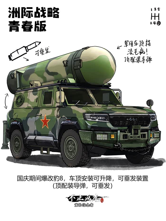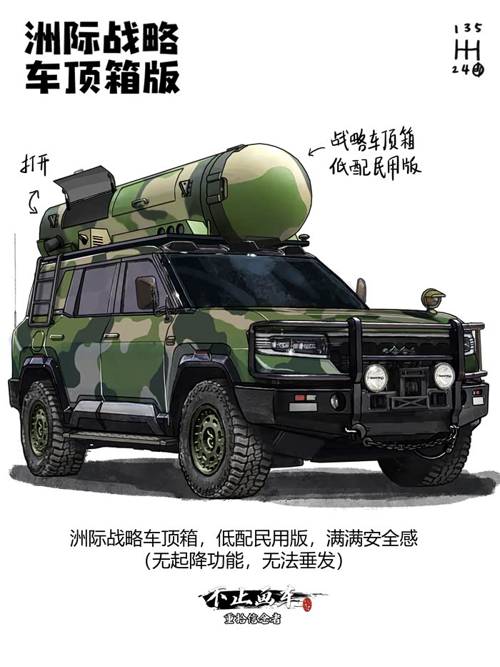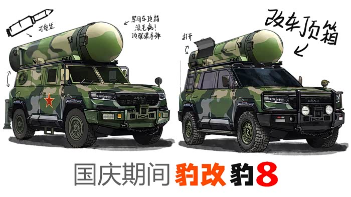 国庆期间,来整个应景的爆改,我把战略洲际东风31加装到了,方程豹 豹8的车顶上,民用版还可以打开,作为车顶箱使用。