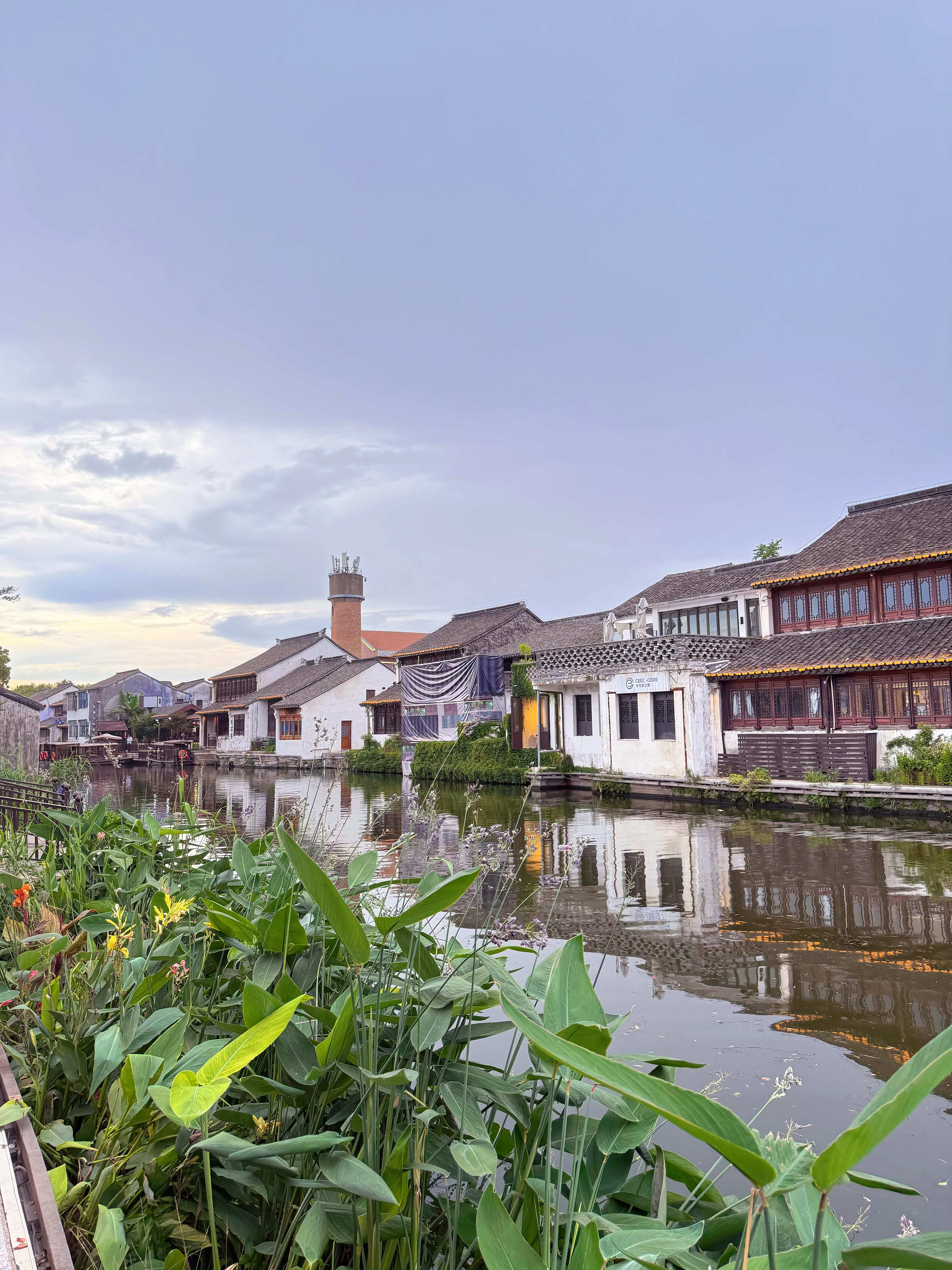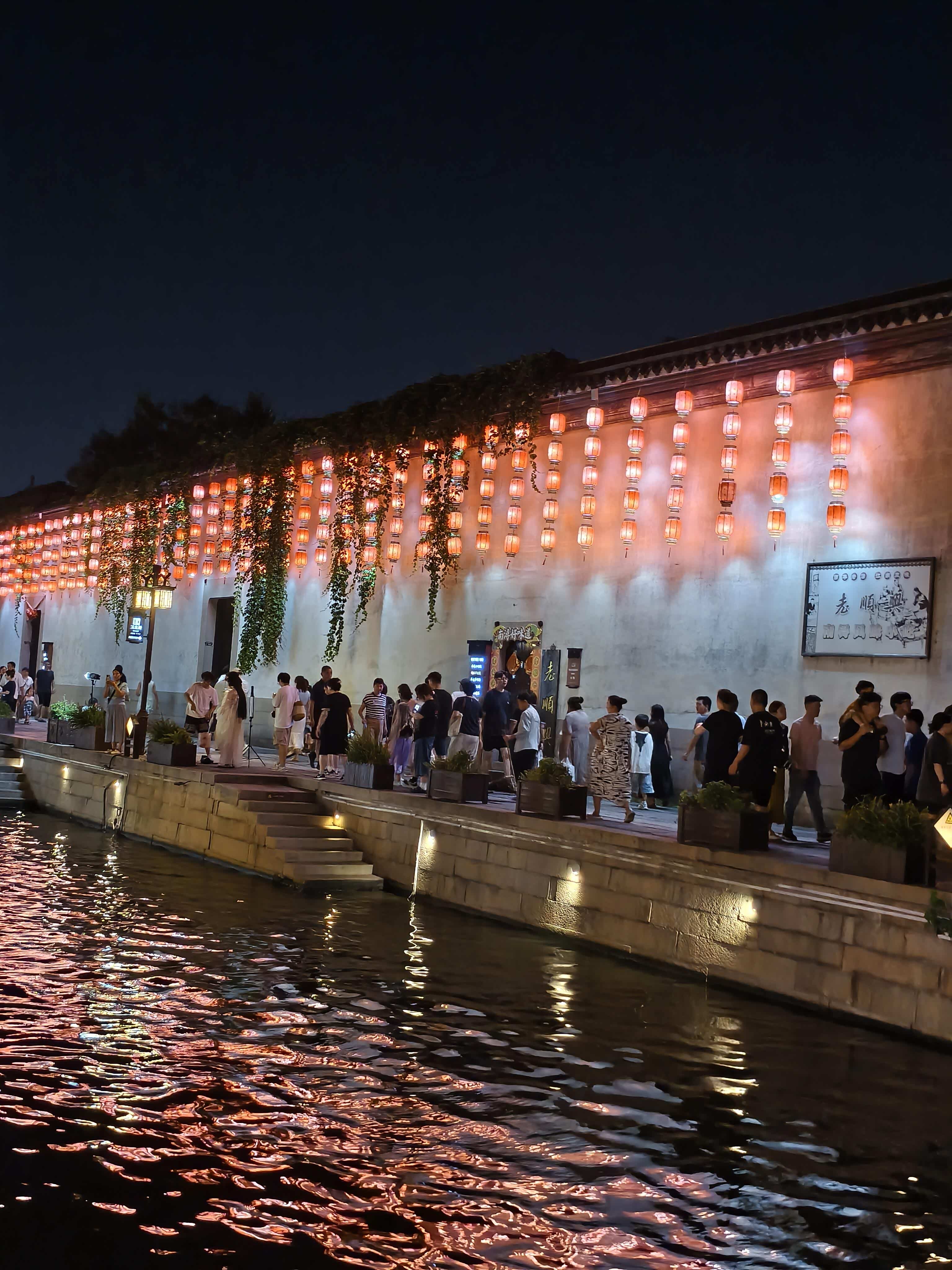 再往前走就是百间楼,这是南浔最有名的老建筑群,沿着河建了整整100间房子,连屋檐的高度都差不多。晚上的百间楼比照片里更有味道:每间房子的木格窗里都透出暖黄的光,有的窗户开着,能看到里面有人在吃饭,筷子碰撞碗碟的声音轻轻传出来;有的窗台上摆着盆栽,绿萝的叶子垂下来,在灯光下晃悠悠的。河边的石阶上,有几个小孩在玩水,家长坐在旁边的石凳上看着,手里拿着刚买的棉花糖,偶尔提醒一句“别摔着”。我也找了个石凳坐下,风从河面上吹过来,带着点荷叶的清香——原来不远处有片小荷塘,虽然没开花,但叶子长得特别茂盛,偶尔还有青蛙“呱呱”叫两声,特别有夏天的感觉。