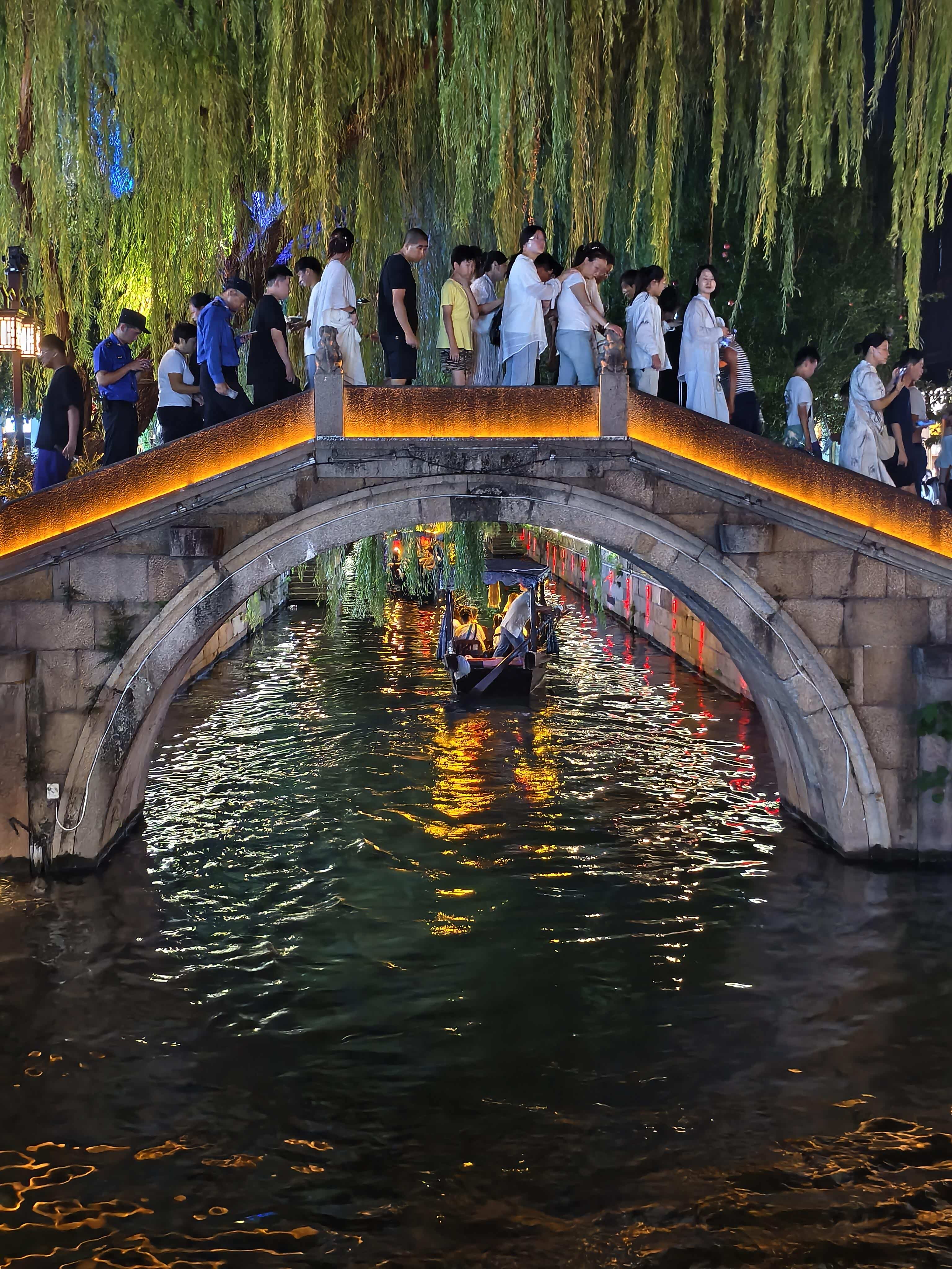 正坐着,忽然听到“咿呀”的摇橹声,抬头一看,一艘乌篷船从远处划过来。船娘穿着蓝色的土布衫,头上裹着方巾,手里的橹摇得慢悠悠的,船尾拖着一道淡淡的水痕。船上坐着一家三口,小朋友趴在船边,伸手想碰水里的灯光倒影,妈妈赶紧拉住他,爸爸则举着手机拍照,嘴里还念叨“这夜景比白天好看太多了”。我问旁边卖冰粉的阿姨,坐船多少钱,阿姨说“夜游50块钱一个人,能坐40分钟,从这边划到通津桥再回来,能看到灯光秀呢”。可惜我这次没提前预约,阿姨说“下次早点来,傍晚6点就开始预约了,坐最后一班也不晚,9点还有船”。