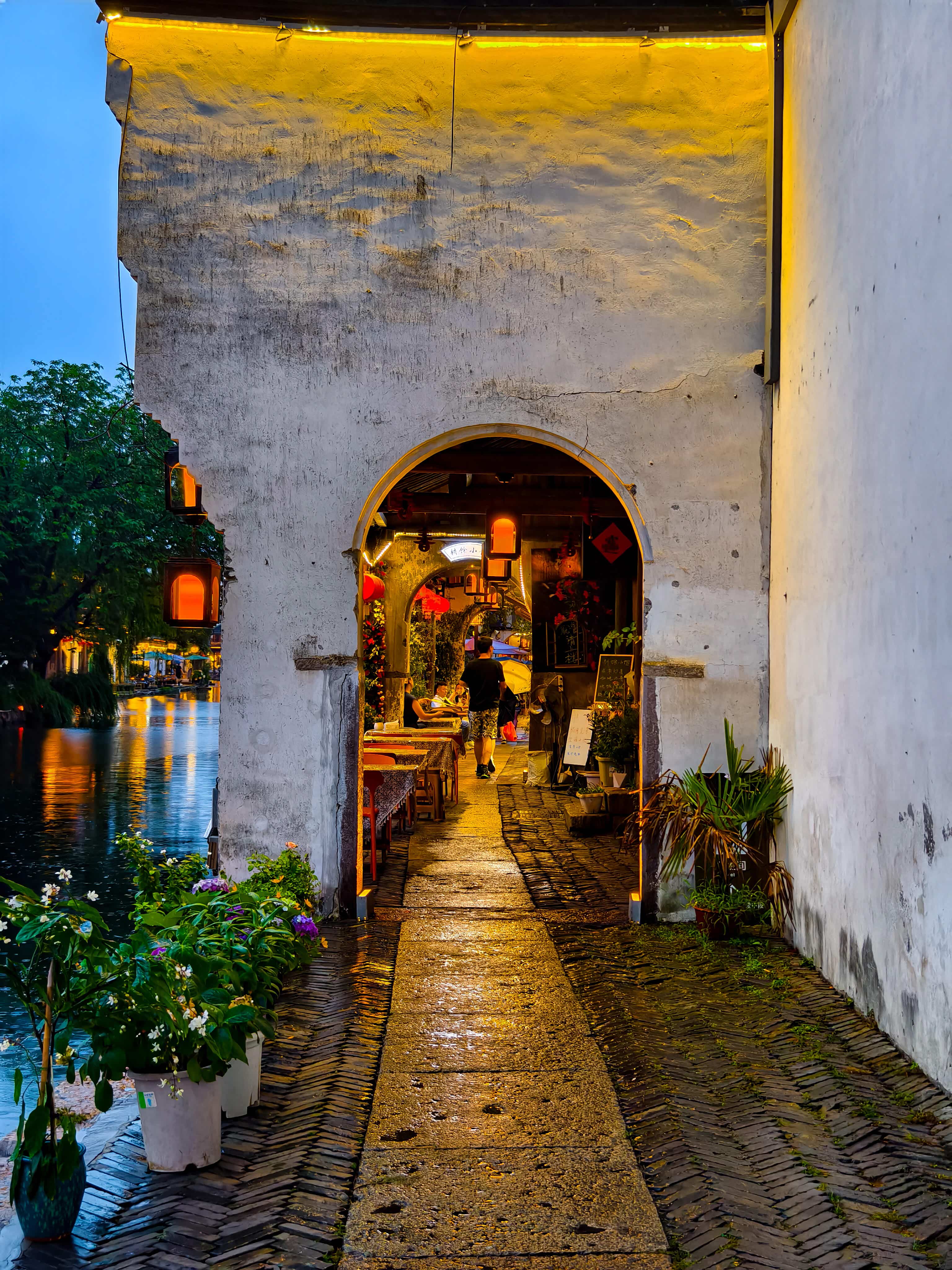 停好车锁上门,A60的自动落锁功能会“嘀”一声提醒,还会顺便关掉没关紧的车窗,特别省心。从停车场走到古镇入口也就3分钟,刚拐进巷口,就觉得一阵凉风裹着水汽吹过来——是河边的风!白天的燥热瞬间散了大半,连呼吸都变清爽了。入口没有门票检查,直接就能进,往里走两步,眼前的景色一下子亮了起来:沿河边的屋檐下,一串一串的红灯笼全亮了,有的挂在柳树枝上,有的垂在木质廊柱旁,灯光映在河水里,随着水波晃啊晃,像撒了一河的碎金子。
