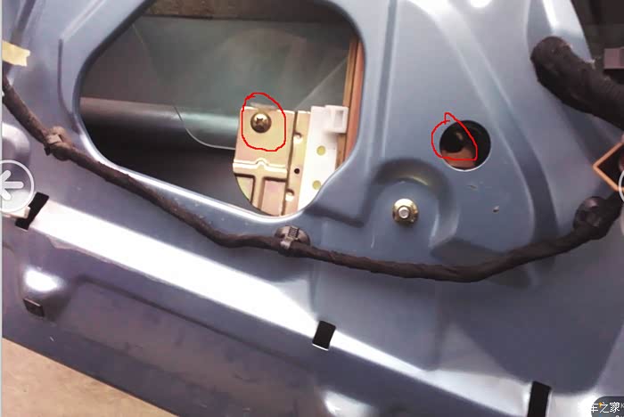 将玻璃向下降到合适的位置,便于螺丝刀拆卸固定玻璃的螺钉。方法为电动降窗(毕竟齿轮上损坏的齿仅仅是个别的),电动无法操作则用力下压降玻璃。 然后拆导轨上固定玻璃的2颗螺钉(见下图),此时应防止玻璃跌落打碎!建议叫个帮手帮忙将玻璃提起来。若仅一人,可先将玻璃慢慢放到车门底部。