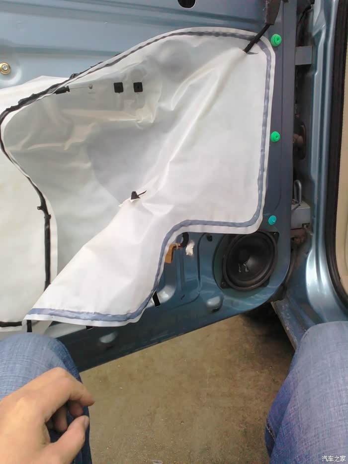再将防水膜周边撕开。将各导线束和车门拉手钢丝拉线从防水膜掏到车门一侧。