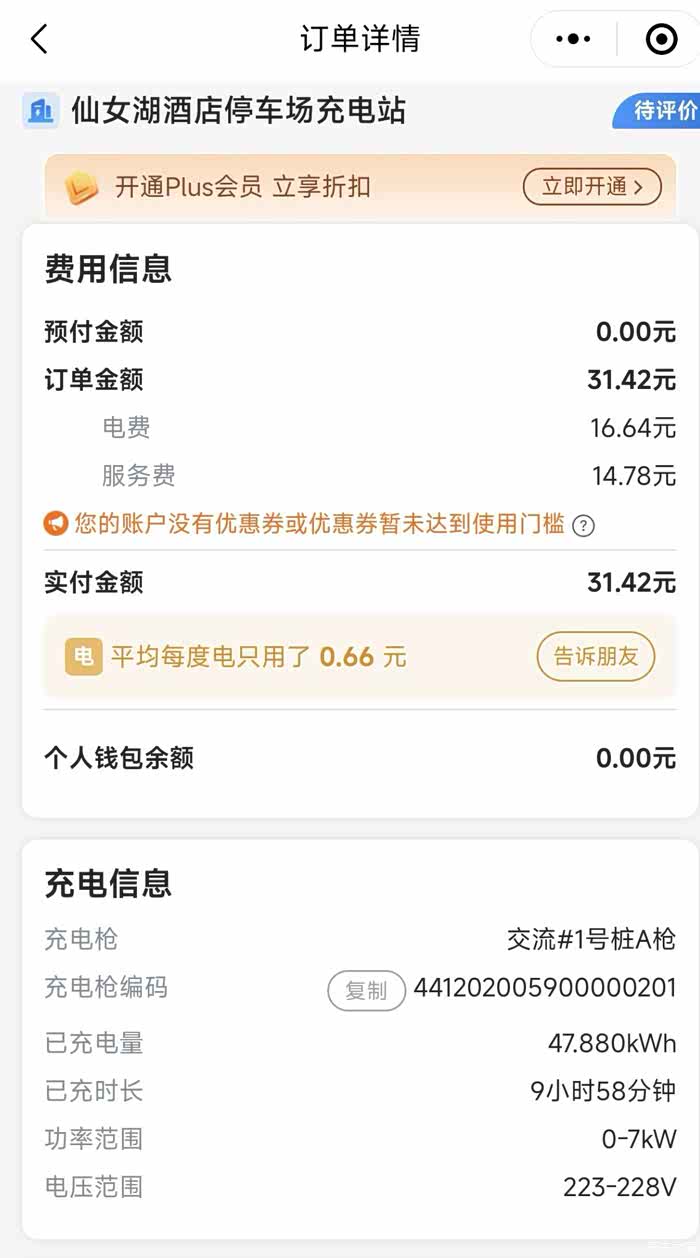 成本也很低:大概是充了5个多小时,电费16.64元,服务费14.78元,实付金额31.42元,相比油费简直是“白菜价”了哈哈。