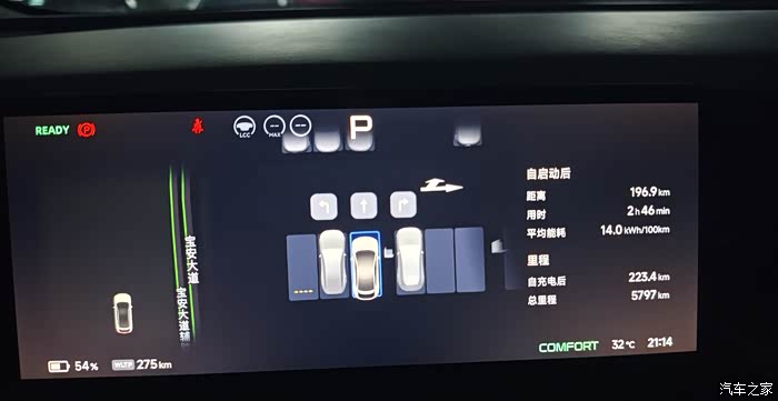 傍晚18:25,电量93%(表显470km),我们沿着广佛肇高速回深圳。返程全程继续信赖NGP,可能是心情放松加之天气不错,平均能耗居然降到了14kWh/100km,一路轻松听歌聊天,到家电量还剩54%。