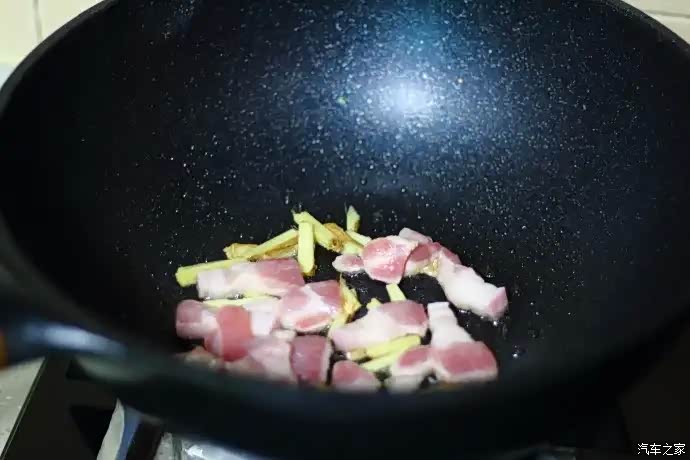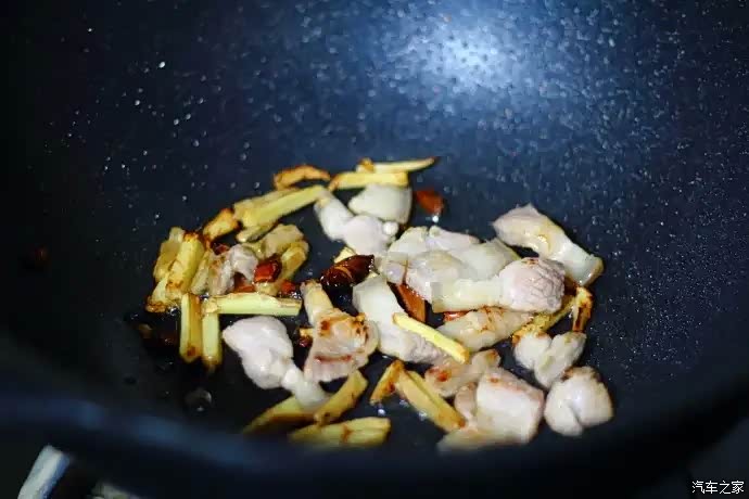 3、燃气灶开火,锅烧热之后放入洗净切好的生姜和肥瘦相间的肉一起小火慢慢煸炒(纯瘦肉单独后下锅);
