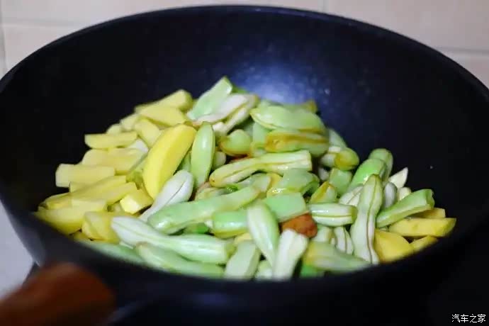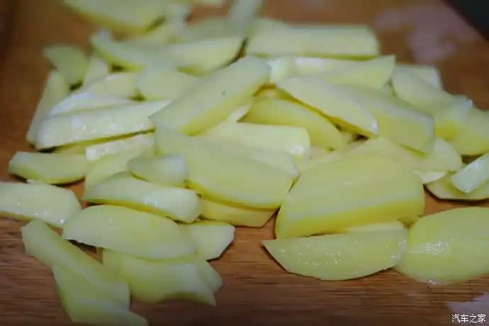 8、翻炒豆角的过程中将黄心小土豆切成0.5cm左右厚的长条,切好之后用清水冲洗掉表面的淀粉;
