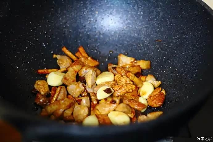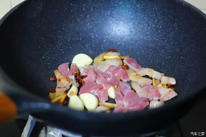 5、翻炒出香味之后加入蒜和瘦肉一起炒,做炖菜的蒜可以不用切直接整个下锅;