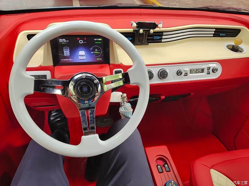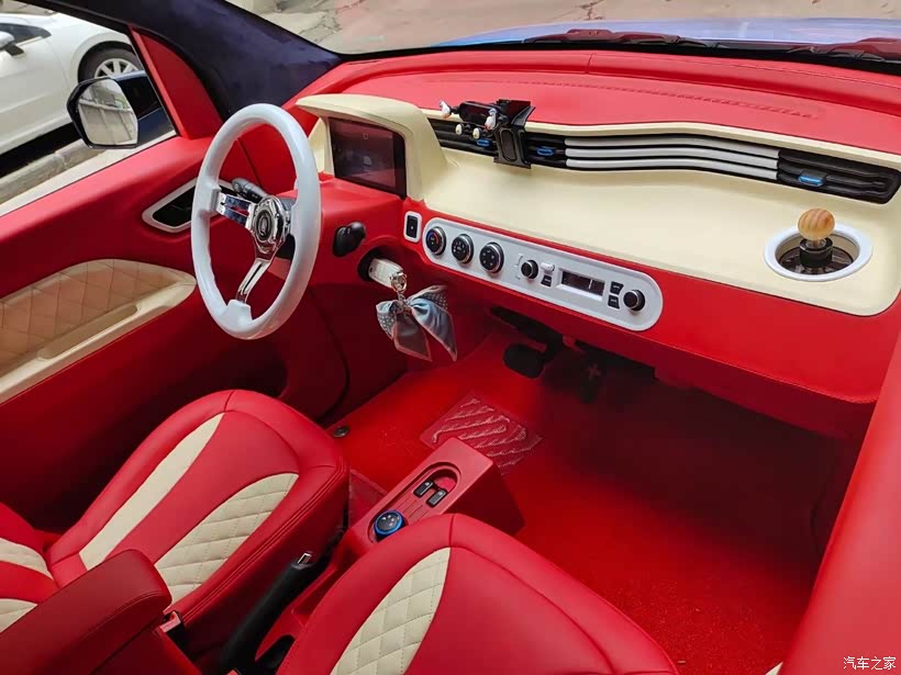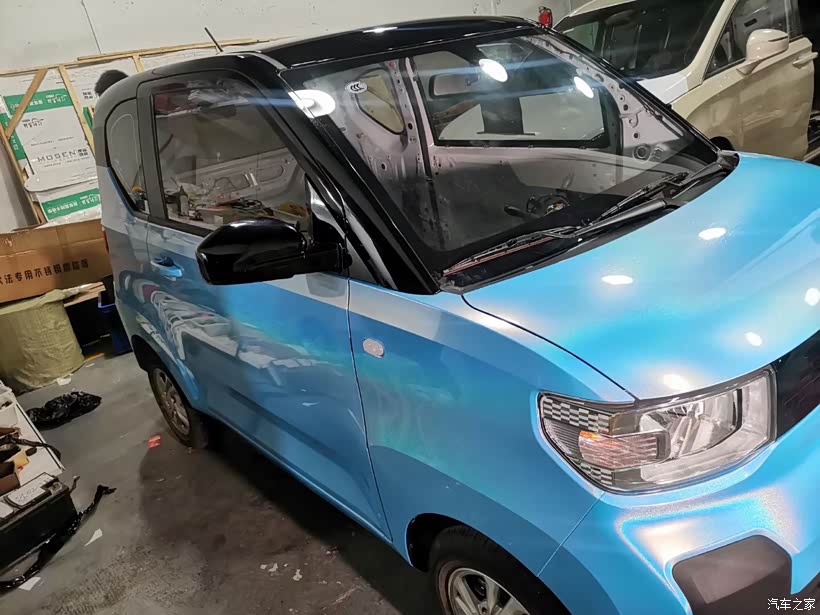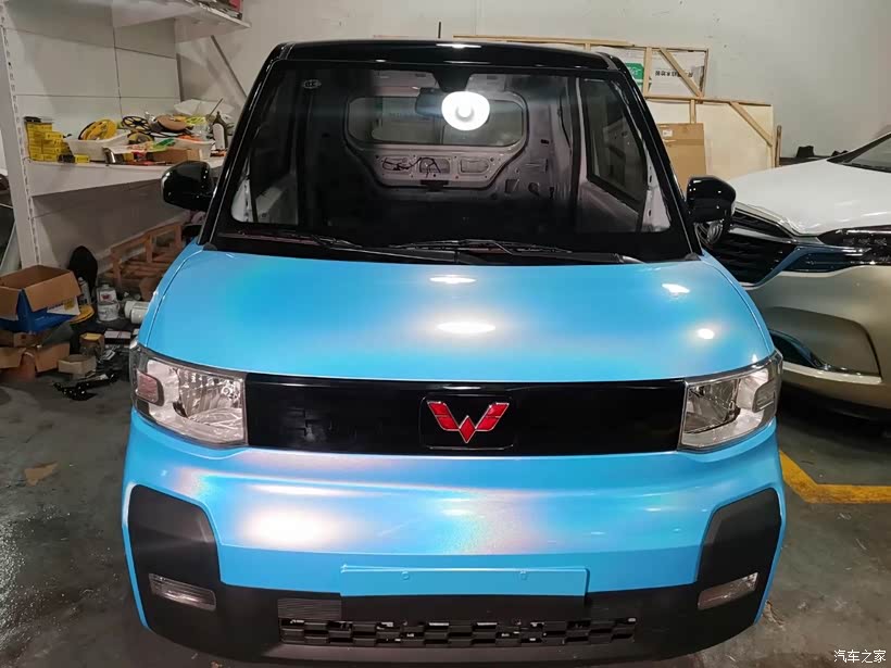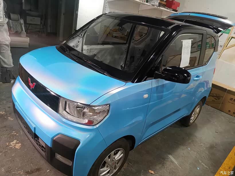 这款五菱宏光迷你是一款外观小巧可爱的电动车,也正是因为外观可爱体型小巧备受女生的喜欢。购买这台车的消费者一般也都是女性,用于家用代步,接娃上学都是很不错的。送女生这款车就一定要凸显它的特点,改装也就成了关键点,为此我选择了他最爱的蓝色的车膜,内饰选用雍容华贵的红色。