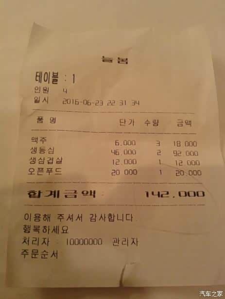 哇噻!吃完一结帐,14万,一是太腐败了, 二是知道被宰了! 在这里要提醒一下:如果在韩国要吃烤肉, 一定要去当地的小街小巷里找,这种地方往往都是当地人去吃烤肉的地方。 不能在繁华的闹市找,特别是一些拿着烤肉店广告并说着一口流利中国话的向导, 你跟着去了, 就会像这张结帐单一样:挨宰吧!